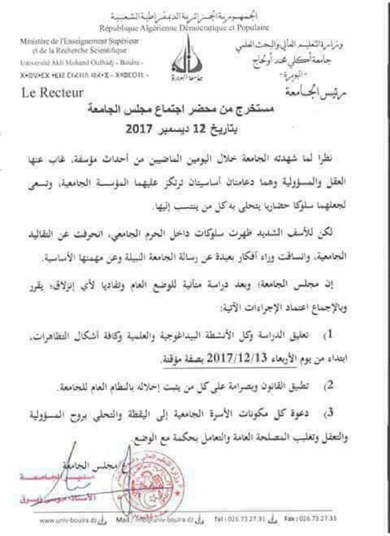 Le recteur, qui a appelé dans un communiqué au calme, a menacé de l’application des lois régissant le fonctionnement de l’université. La décision du conseil d’administration de l’université de Bouira a suscité moults interrogations sur les réseaux sociaux.