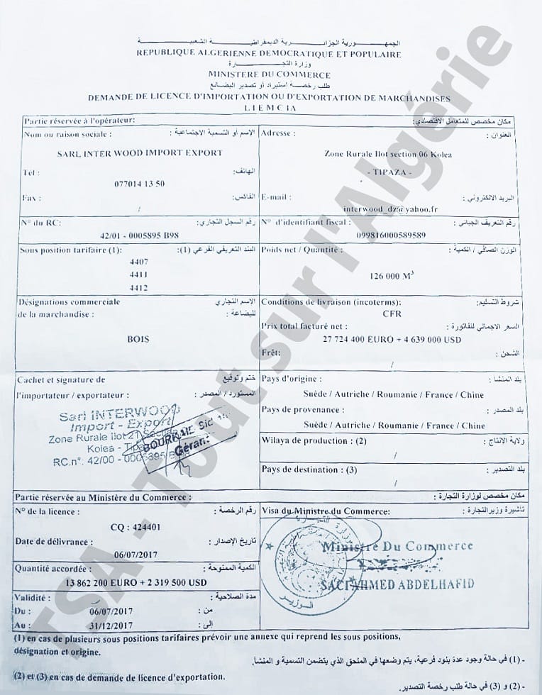 Le 6 juillet, la Sarl Inter wood import-export a obtenu une licence d’importation de bois sous le numéro CQ : 424401. Elle porte sur l’importation d’ « une quantité de 126.000 m3 de bois pour un montant net de 27.724.400 euros et 4.639.000 USD », selon le document dont nous détenons une copie.
