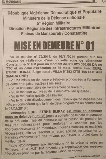 L’annonce a été publiée dans les colonnes de plusieurs journaux, dont El Moudjahid. L’Eurl ETRHB Blikaz est mise en demeure par le ministère de la Défense nationale. L’armée demande à l’entreprise de renforcer le chantier « afin de résorber le retard accusé » et de « livrer le projet dans le meilleur délai ».