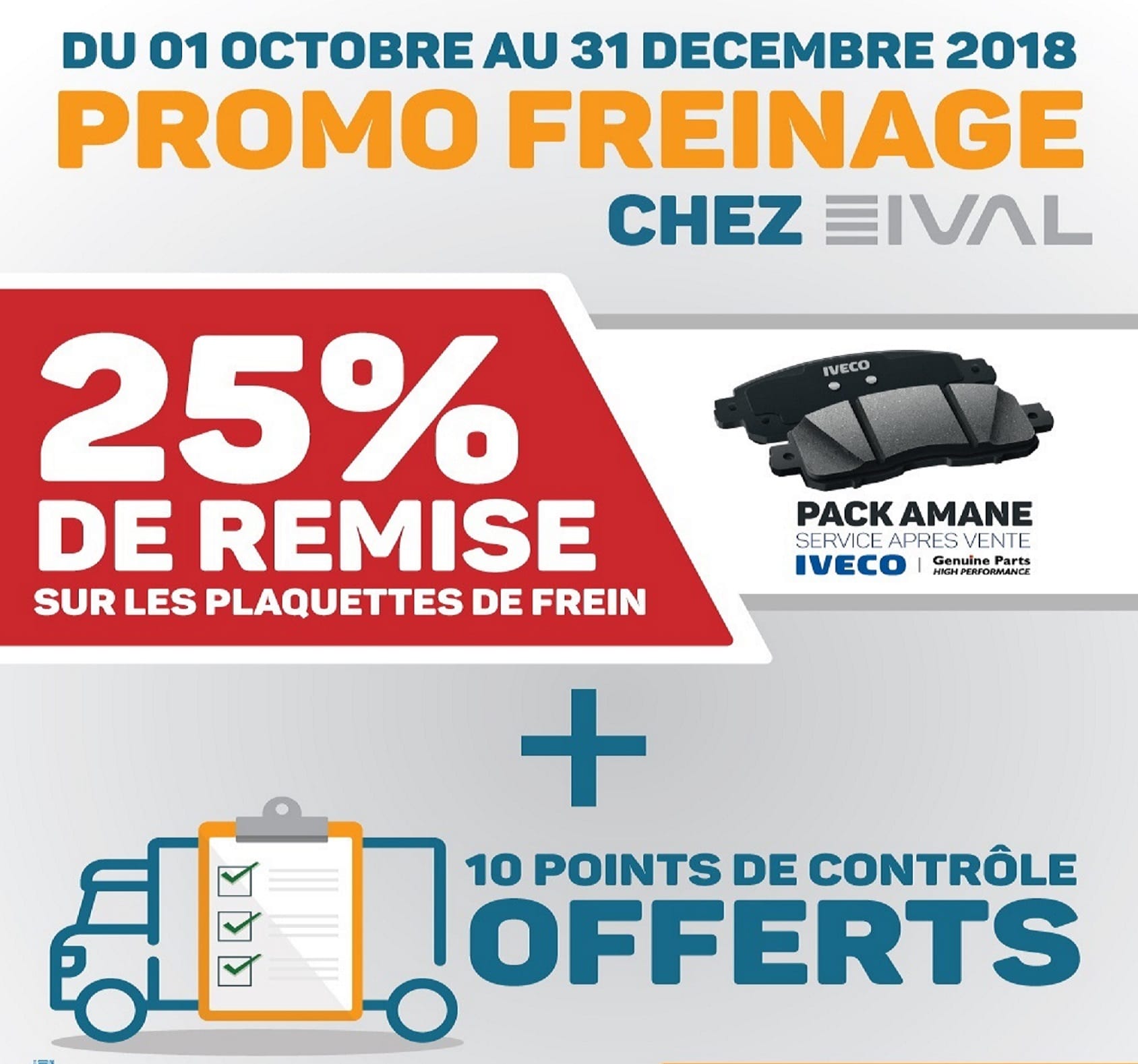 En effet, et dans la continuité de ses offres et campagnes de service après-vente, IVAL propose une promotion durant les trois derniers mois de l’année en cours destinée au système de freinage de toute la gamme Iveco.