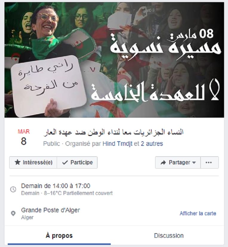 Après sa participation aux manifestations des vendredis 22 février et 1er mars, Hind a eu l’idée de créer un événement Facebook à l’occasion de la journée internationale des droits des femmes. « Je voulais changer des Cheb Yazid et des femmes qui sortent de la Coupole (lors du meeting du FLN pour annoncer la candidature de Bouteflika), fleurs à la main. Pourquoi ne pas marquer le coup ? » dit-elle. Selon elle, la situation actuelle est propice à ce que « pour une fois, on puisse faire de cette date du 8 mars une belle journée au service des droits des femmes ».