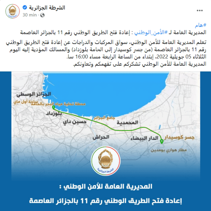 Après cinq jours de fermeture totale pour la préparation et l’exécution de la parade militaire ce mardi 5 juillet à l’occasion de la célébration du 60e anniversaire de l’indépendance, la rocade nord d’Alger va être rouverte à la circulation automobile. L’annonce a été faite par la DGSN dans un communiqué.