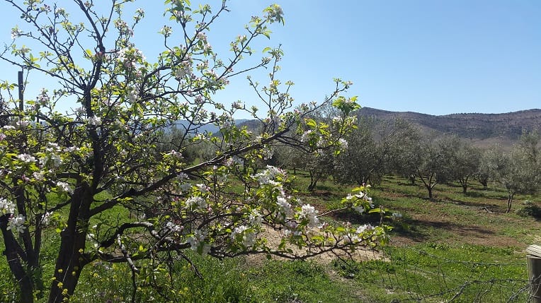 Un pommier en fleurs à côté d’un champs d’oliviers du Moulin Fatima