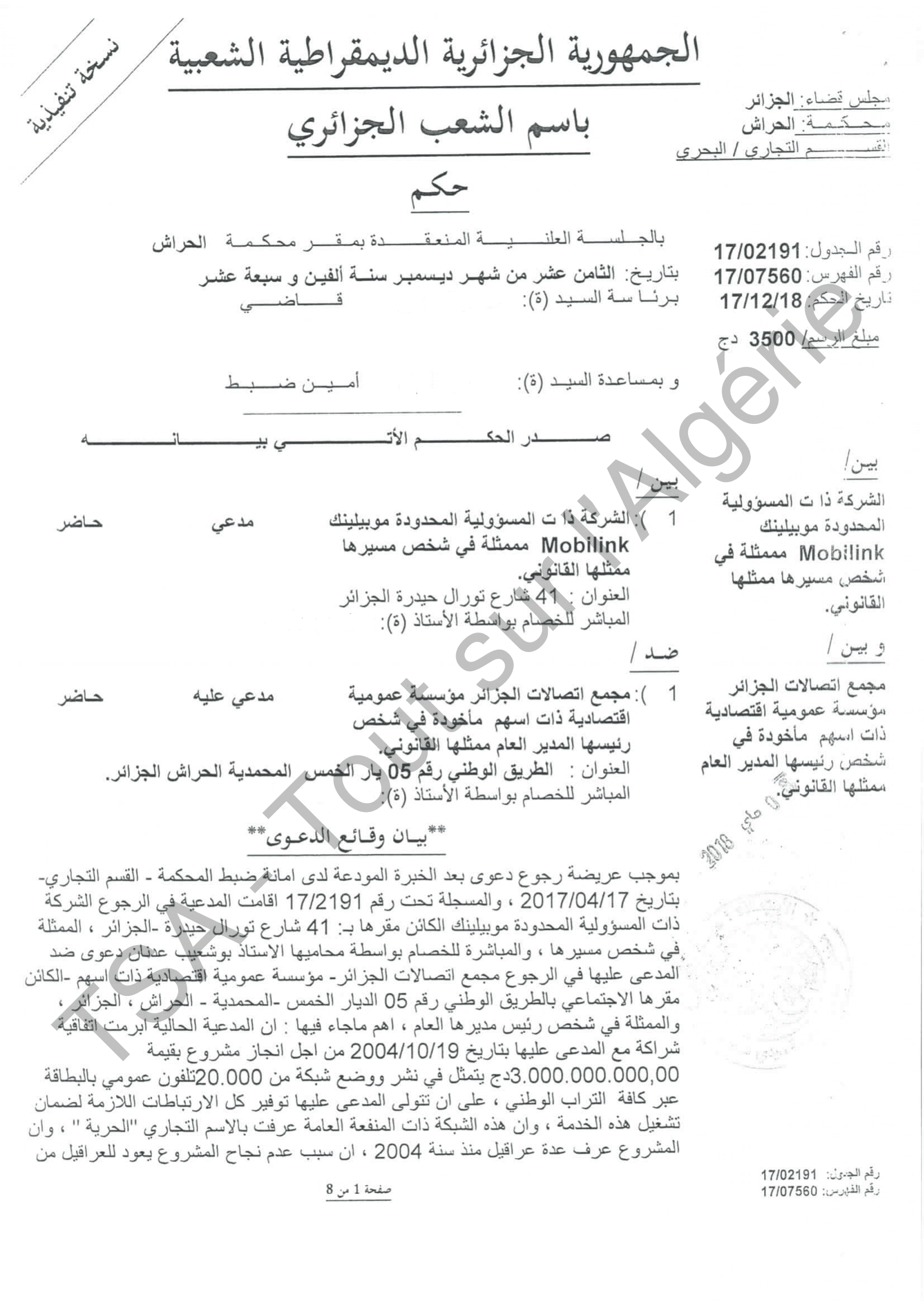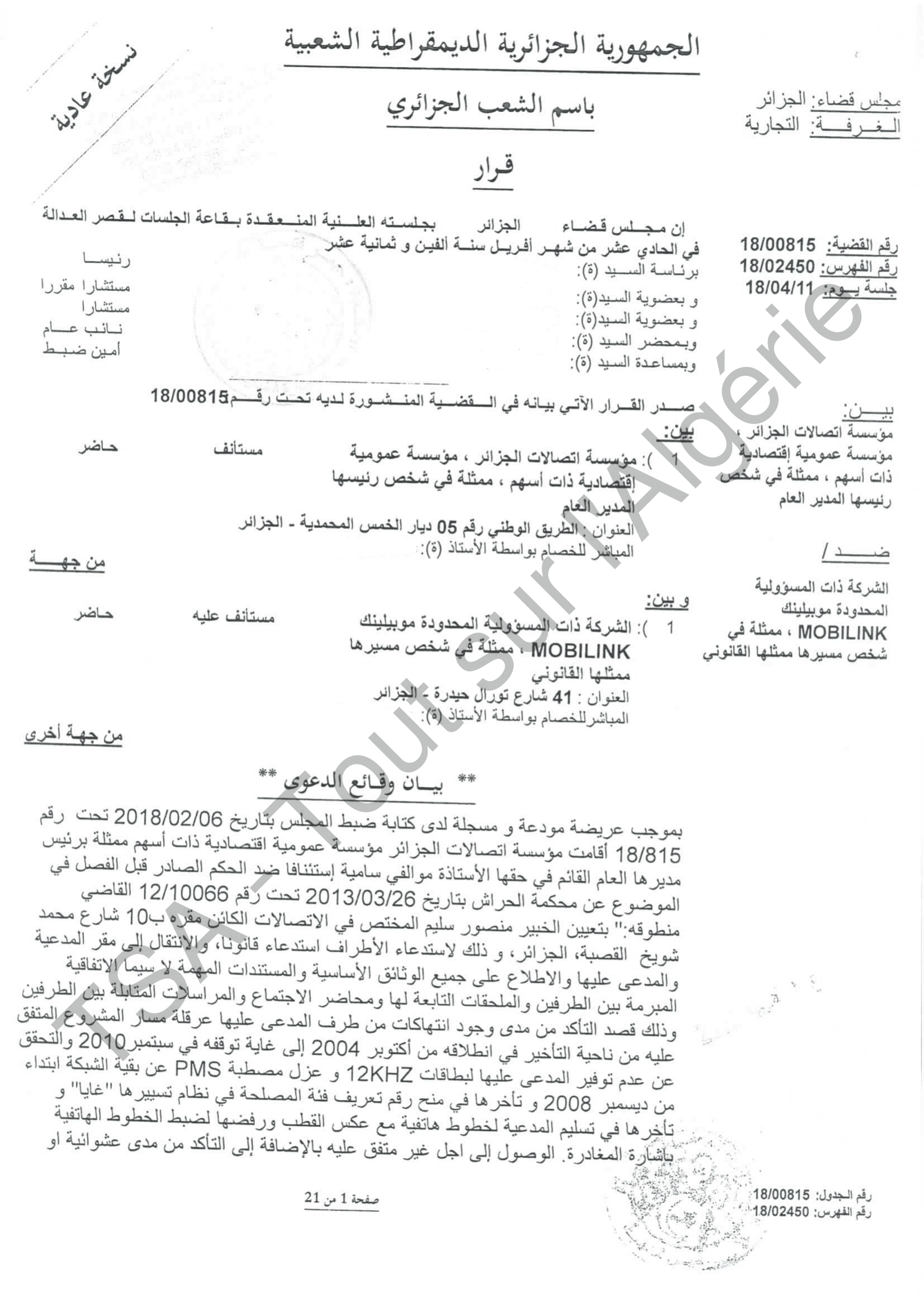 L’affaire se résume à deux volets, une plainte intentée par AT et une autre par Mobilink, une dizaine de jugements et d’ordonnances, presque tous en faveur de l’entreprise privée. Cette dernière est présentée sous la dénomination de Sarl Mobilink, ayant son siège social au 41, rue des Tourelles Hydra, Alger et représentée par Kouninef Rédha (président de l’AGO), Kouninef Karim Abdelkader (membre de l’AGO), Kouninef Noah Tarik (assesseur) et Bettaher Kaddeur (gérant).