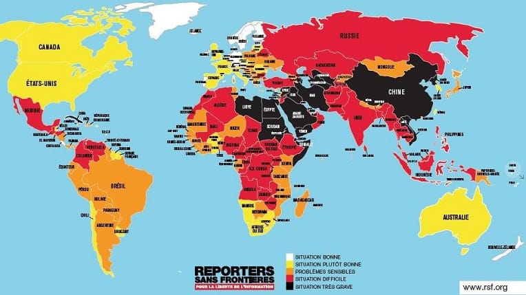 La carte du monde dressée par RSF à partir de son classement mondial de la liberté de la presse s’est encore assombrie: 21 pays sont désormais placés en situation « très grave », un niveau record, l’Irak ayant rejoint cette année cette catégorie où figurent des régimes autoritaires comme l’Égypte (161e), la Chine (176e) ou la Corée du Nord, toujours en 180e et dernière position.