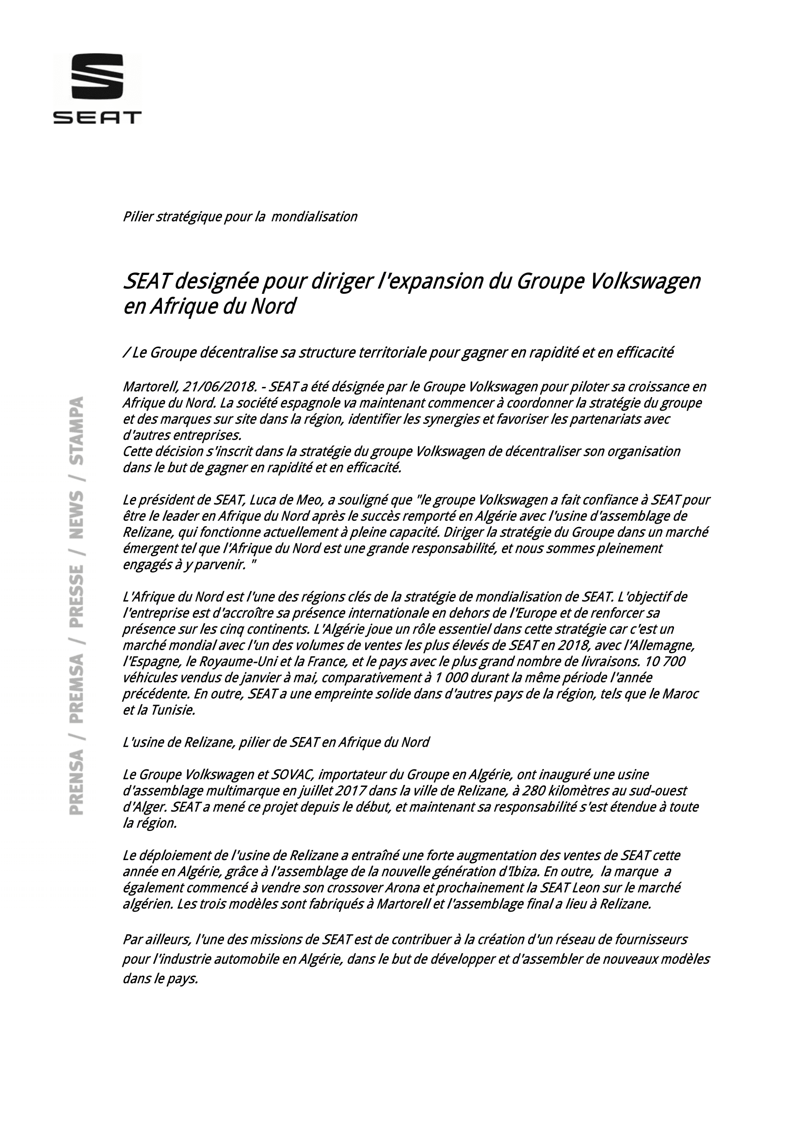 Seat désignée pour diriger l’expansion du Groupe Volkswagen en Afrique du Nord