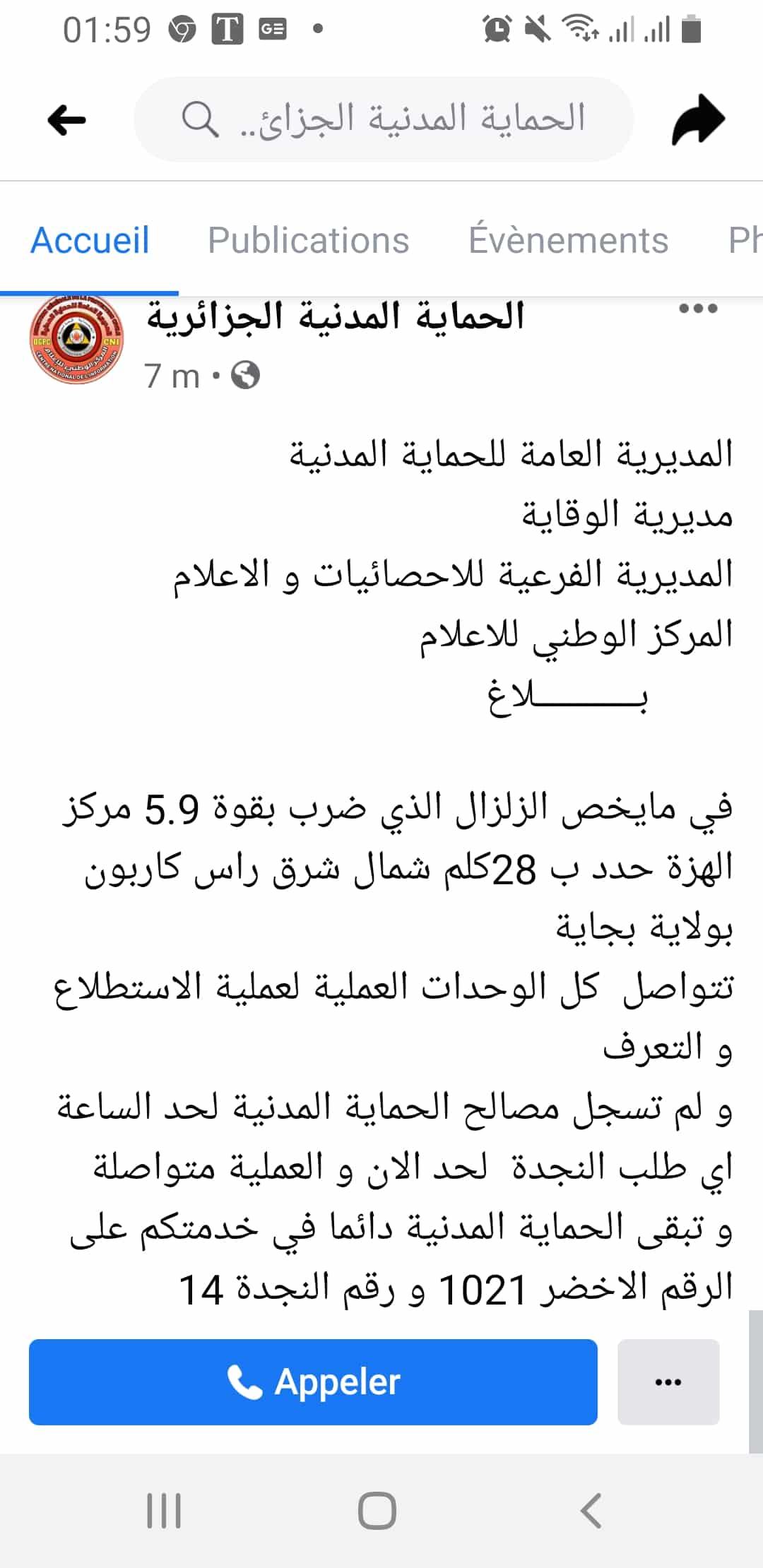 La Protection civile indique que les opérations de reconnaissance se poursuivent à Bejaia après le fort séisme qui a frappé cette région et qu’aucun appel à l’aide n’a été enregistré.
