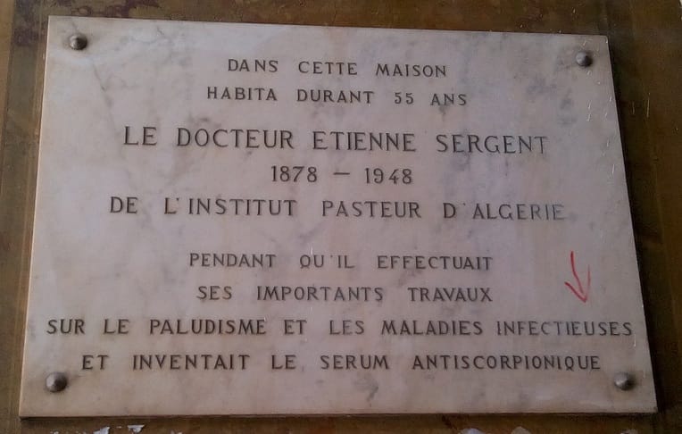 Il y a juste une plaque en marbre apposée sur le mur gauche du hall d’entrée de l’immeuble du 8, rue Didouche Mourad (ex-Michelet), à Alger. Une plaque sobre, modeste, discrète, sans fioritures ni ostentation. Qui dit que le Dr Étienne Sergent a habité dans ce bâtiment, qui fait angle entre la rue Didouche Mourad et le boulevard Mohamed V, pendant 55 ans. Mais, l’essentiel, l’important n’est pas là. À la neuvième et dernière ligne du texte, où l’on découvre que le toubib en question fut l’inventeur du sérum antiscorpionique.