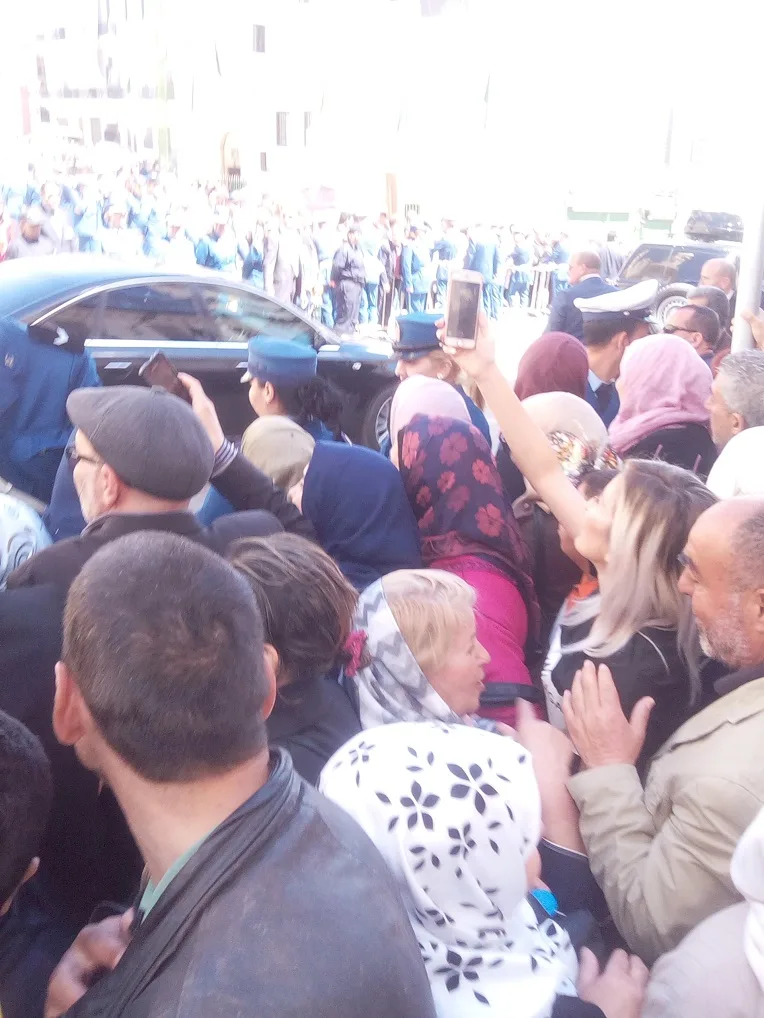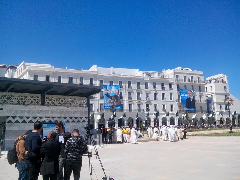 La foule est déçue. « On veut voir le président !», crie une femme. « Il ne viendra pas nous saluer ? », demande une autre à un agent de l’ordre, qui ne sait quoi répondre. Comme s’il l’a entendue, Bouteflika sort saluer la foule par l’entrée principale. Il apparaît en haut des marches de la bâtisse. Il est accueilli par des youyous et des slogans.