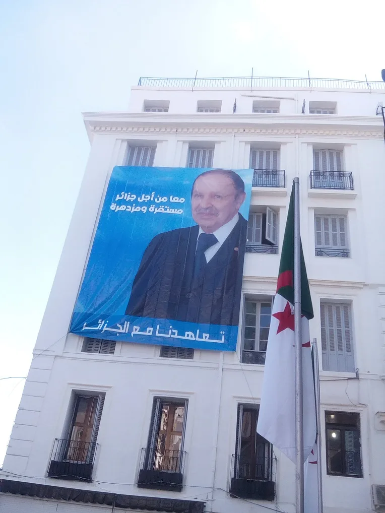 « Maintenant c’est certain. Lorsque c’est Ould Abbas qui l’a annoncé, je n’y ai pas trop cru. Regarde cette banderole, ça ne te dit rien ? ». Il montre du doigt la façade du bâtiment qui fait face à la mosquée, recouverte d’un poster aux mesures surdimensionnées et sur lequel le portrait de Bouteflika est barré de cette phrase qu’on peut lire de très loin : « Ensemble pour une Algérie stable et prospère ». « N’est-ce pas un slogan de campagne ? », poursuit-il, sûr de lui.