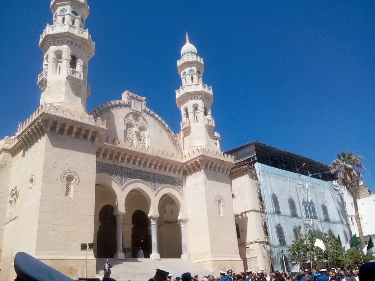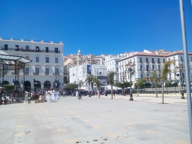 Une autre sirène, un autre motard. Ce n’est qu’après la quatrième que le véhicule noir blindé et muni d’une kyrielle d’antennes passe, suivi par plusieurs autres voitures aux vitres teintées, roulant à vive allure. Cinq minutes plus tard, le chef de l’État arrive destination : la Place des Martyrs et la mosquée Ketchaoua.