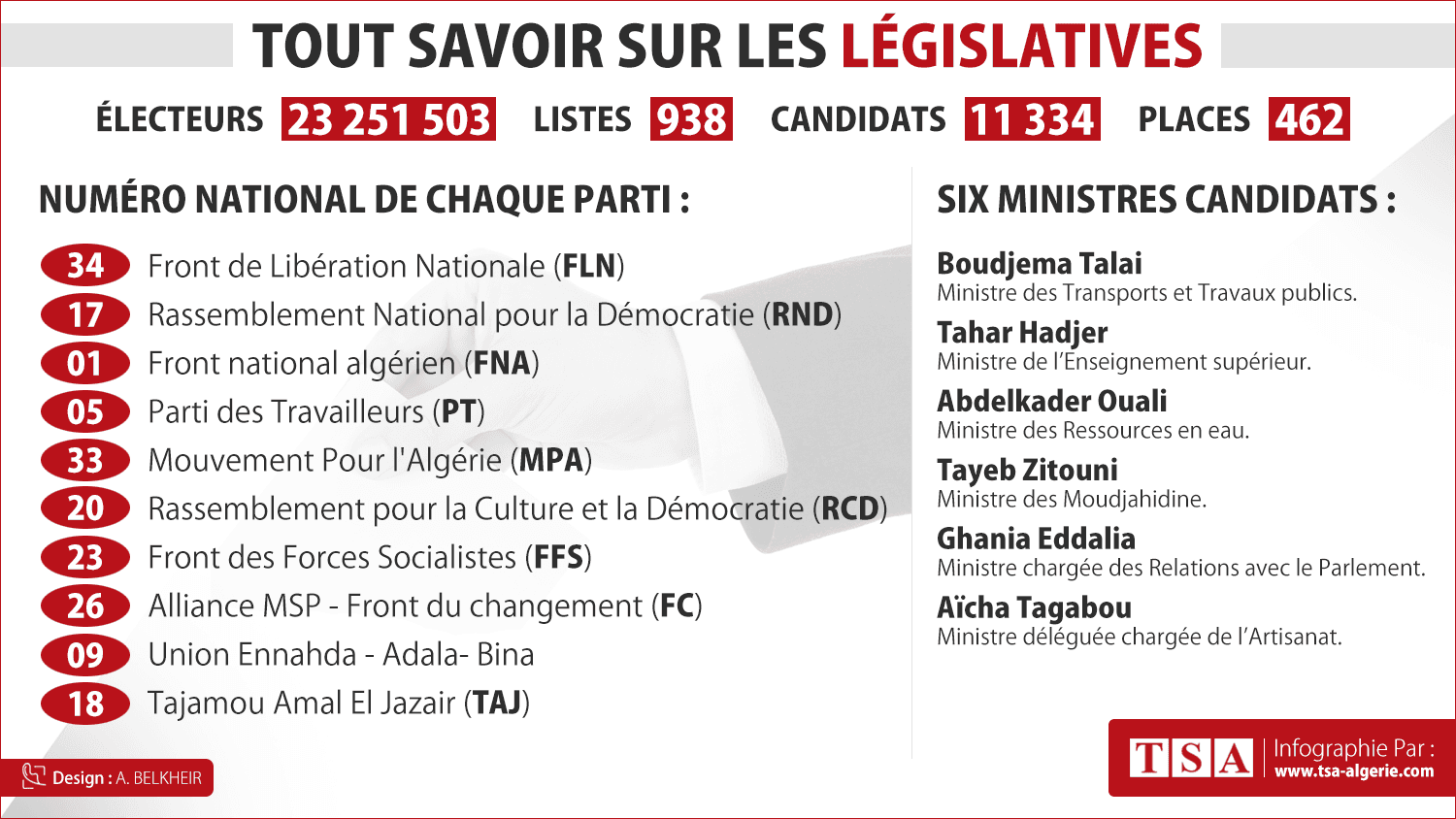 Du côté des partis et alliance islamistes, l’Union Ennahda – Adala- Bina sera représentée par le numéro 9 et l’Alliance MSP – Front du changement (FC) sera représentée par le N° 26. Le parti Tajamou Amal El Jazair (TAJ) a pour sa part eu droit au N° 18.
