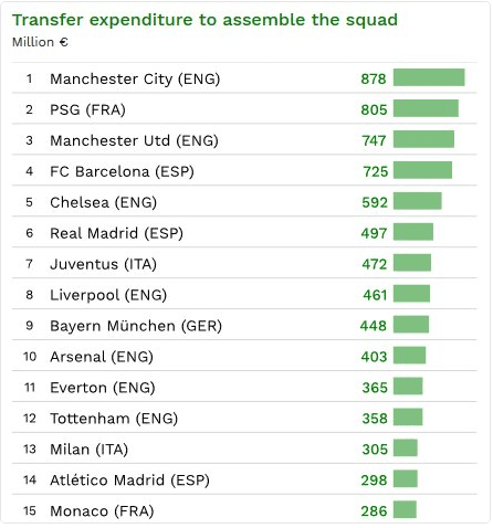 New @CIES_Football analysis on transfer spending to sign current squad members: @ManCity (€878 M) has costliest squad in history ahead of @PSG_inside (€805 M) & @ManUtd (€747 M), data for all big-5 league clubs at https://t.co/KA1Tpnadoq pic.twitter.com/A6bFfheypr