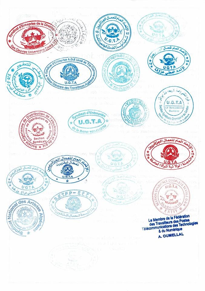 Le communiqué est signé par « Les cadres syndicaux de la wilaya de Tizi Ouzou, représentants les syndicats Naftal GPL, Education, Formation professionnelle, Santé, Travaux publics, ADE, ONA, Algérie Télécom, Algérie Poste, Œuvres universitaires, ERIAD, ORAC, Sonelgaz, ONAPH, ENEL, l’IATIT, OPGI, BADR, Chemiserie LNI, Protection civile, Syndicats des artistes, les représentants des comités des retraites, et le Comité des femmes travailleuses ».