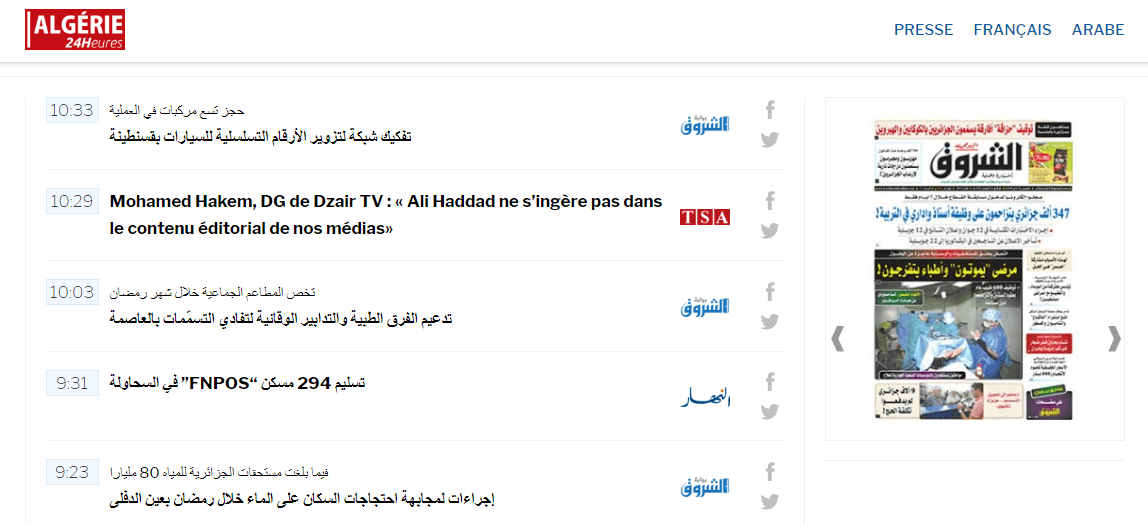 Le nouveau site propose une sorte de revue de presse algérienne en temps réel en reprenant les titres des principaux médias francophones et arabophones : El Watan, Liberté, TSA, Le Quotidien d’Oran, El Khabar, Echorouk…