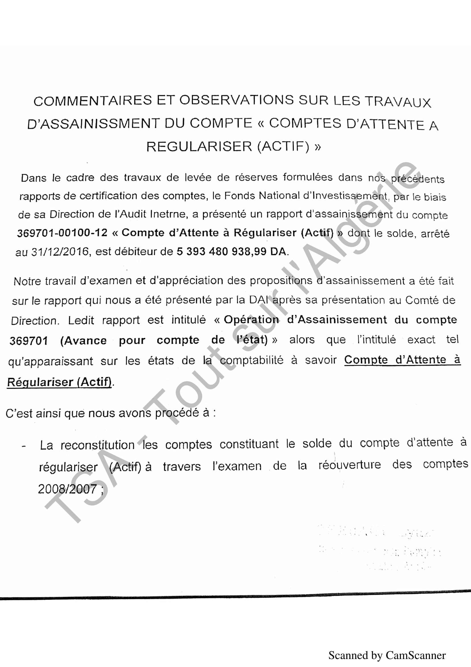 Un trou financier de plus 5 milliards de dinars (500 milliards de centimes) a été détecté dans les comptes du Fonds national d’investissement (FNI). Selon le rapport du commissaire aux comptes daté de février dernier et dont nous détenons une copie, le compte N° 369701-00100-12 (compte d’attente à régulariser, englobant plusieurs comptes débiteurs) présentait au 31 décembre 2016, un solde débiteur de 5 393 480 938,99 DA.