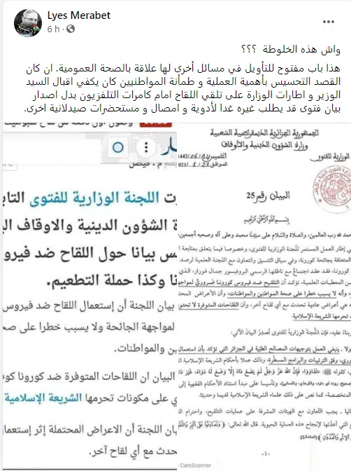 « A lumière de la coopération avec le comité scientifique de suivi de l’évolution de Covid-19, la commission s’est réunie avec le porte-parole du comité scientifique, Pr. Djamel Fourar qui a apporté des clarifications et présenté un ensemble de données scientifiques confirmant que la vaccination contre la Covid-19 était indispensable pour faire face à cette pandémie, soulignant que les vaccins disponibles ne contenaient pas de composants prohibés par la Charia », a indiqué la Commission dans un communiqué.