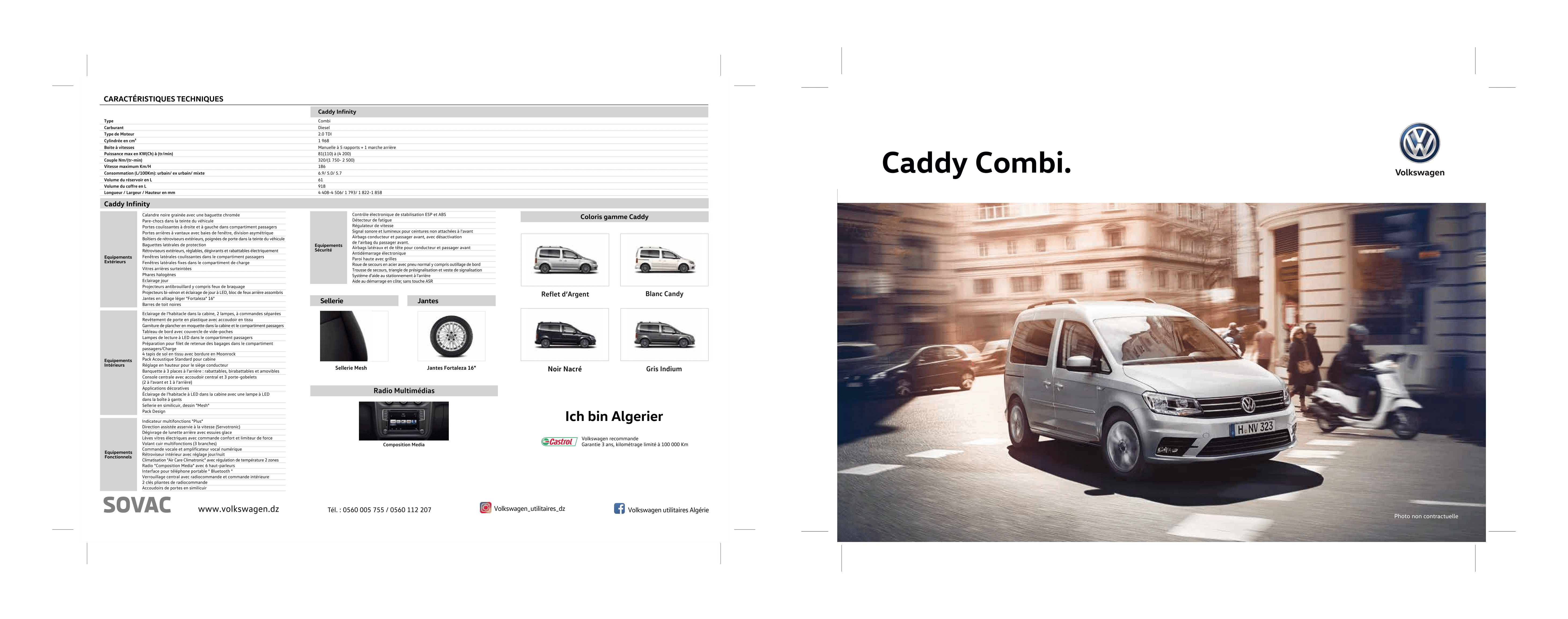 Le Caddy Combi Maxi offre une gamme impressionnante de fonctions comme l’indicateur multifonctions PLUS, direction assistée asservie a la vitesse, dégivrage de lunette arrière avec essuies glace, lèves vitres électriques avec commande confort et limiteur de force, volant cuir multifonctions 3 branches, rétroviseur intérieur avec réglage jour et nuit, 4 hauts parleurs, interface pour téléphone Bluetooth, 2 clés pliantes de radiocommande.