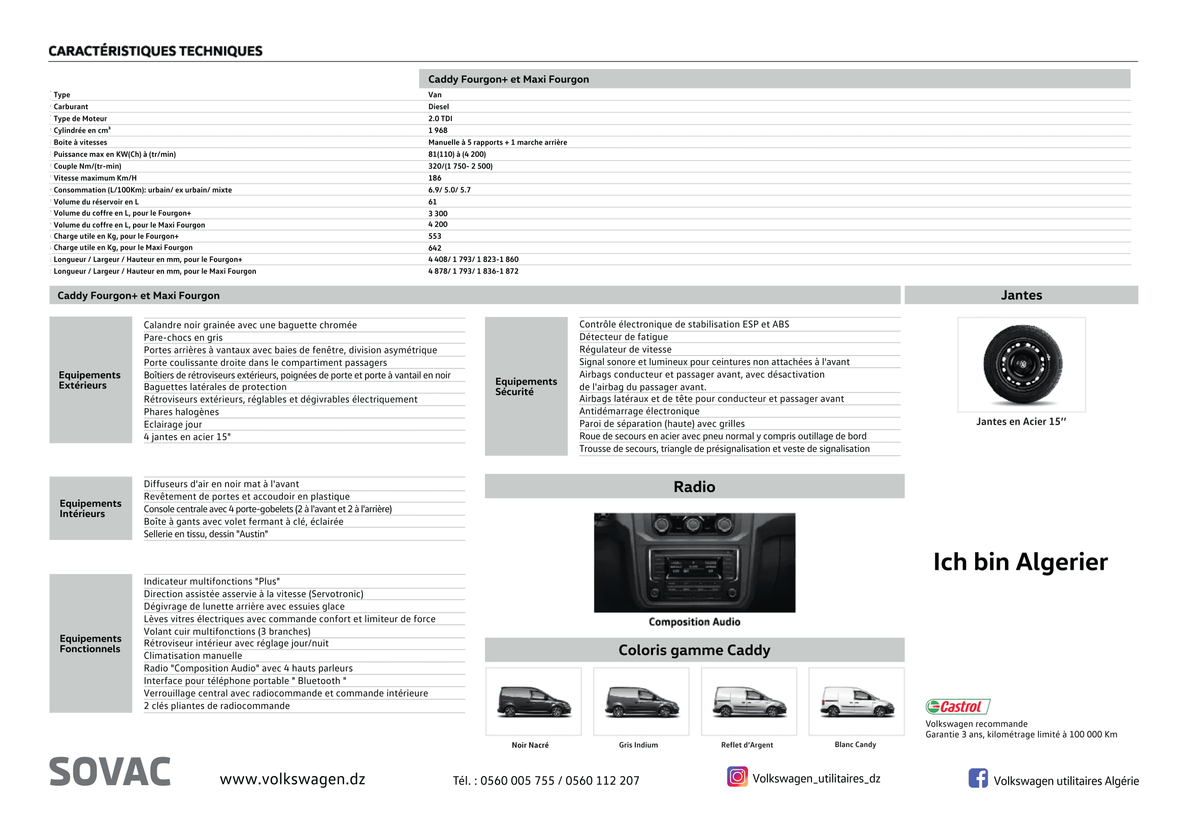 Le nouveau Caddy Fourgon (Plus et Maxi) se caractérise de l’extérieur par sa calandre noire grainée avec une baguette chromée, des Par chocs en gris, portes arrières à vantaux avec baies de fenêtres, division asymétrique, porte coulissante droite dans le compartiment passagers, les boitiers de rétroviseurs ainsi que les poignées et la porte a vantail en noir, baguettes latérales de protection, rétroviseurs extérieurs réglables et dégivrables électriquement, des phares halogènes, éclairage jour, des jantes en acier 15’’. Un habitacle bien rangé de l’intérieur on retrouve un diffuseurs d’air en noir mat à l’avant, revêtement de porte et accoudoir en plastique, console centrale avec 4 portes‐gobelets (2 à l’avant et 2 a l’arrière), boite à gants avec volet fermant à clé, éclairée, sellerie en tissu Austin, pour vous offrir un confort absolu.