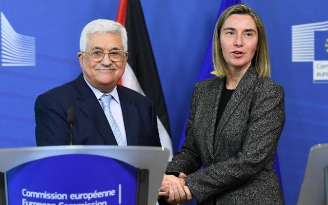 Palestinian President Mahmoud Abbas (L) speaks with EU foreign policy chief Federica Mogherini during a press conference following their meeting at the European Commission in Brussels on March 27, 2017. / AFP PHOTO / EMMANUEL DUNAND